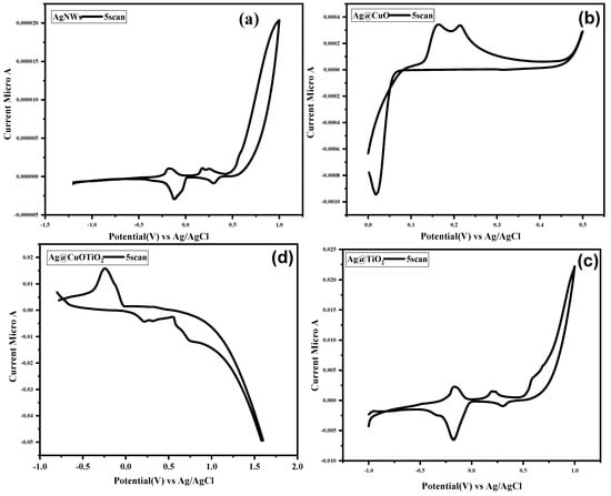 Cyclic voltammogram of (a) Ag NWs, (b) Ag@CuO, (c) Ag@TiO2, and (d) Ag@CuO/TiO2.