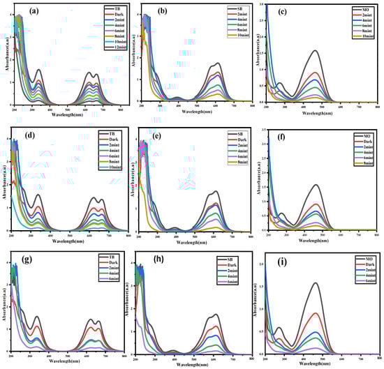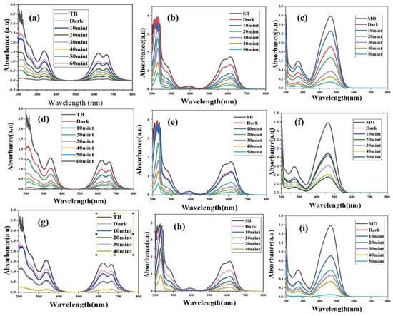 The photocatalytic activity of Ag@CuO, Ag@TiO2, and Ag@CuO/TiO2 coated and hybridized-coated material against dyes such as TB, SB, and MO were monitored using a UV–Vis spectrophotometer. The catalysis phenomenon depends on the catalyst’s ability to capture or remove oxygen radicals [40,41]. In this study, the efficiency of catalysis was established with and without H2O2. The UV spectra of the prepared material against various dye degradation in the absence of H2O2 are shown in Figure 6. The binary core-shell, Ag@CuO, and Ag@TiO2 materials exhibited photocatalytic degradation against the TB, SB, and MO dyes within 50–60 min, as shown in Figure 6a–f. Therefore, 20–25% of unaffected dye still existed. However, in the case of Ag@CuO/TiO2, a hybridized coating of two different metal oxides, the photocatalytic activity improved where these selected dyes were almost fully degraded within 40 min, as presented in Figure 6g–i. These findings suggest that the tertiary nanocatalyst (Ag@CuO/TiO2) developed a greater extent of amorphous zones, as shown by Figure 1d, and has a strong effect to bind with dyes. Materials in the amorphous zone tend to adsorb more dyes because they have a lot of structural voids and interstitial spaces resulting from various deformations [42]. This creates configurational and torsional strain, making their antibonding orbital larger for easy electromagnetic interaction [43]. This interaction leads toward the breaking of the bonding orbital. Moreover, the material might have trapped some environmental oxygen, which also plays a role in degradation.