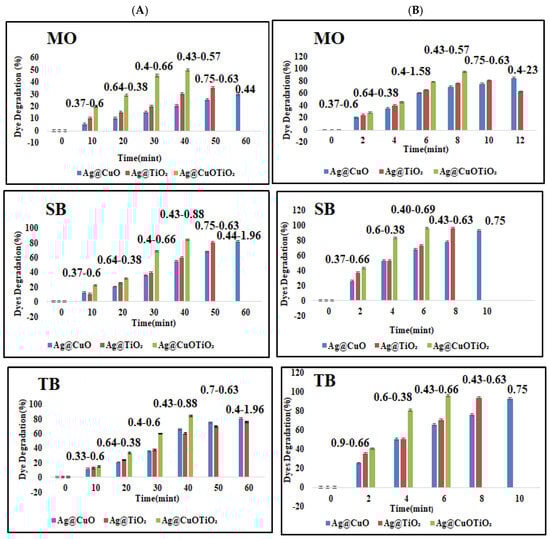 Additionally, the photocatalytic effectiveness of each catalyst was also studied in the presence of an H2O2 reagent, and the outcomes are shown in Figure 7. Figure 7a–c depicts the involvement of the Ag@CuO photocatalyst in the presence of H2O2 for the degradation of TB, SB, and MO, respectively. The efficiency of the Ag@CuO nanocatalyst with H2O2 demonstrated the degradation of these dyes within 10–12 min. Figure 7d–f represents the effect of Ag@TiO2 over the same dyes in the same sequence and pattern, and demonstrated the photocatalysis of TB, SB, and MO between 8 and 10 min. Finally, Figure 7g–i describes the Ag@CuO/TiO2 ternary system’s function in the presence of H2O2, and resulted in the maximum degradation of the dyes within 6 min. The percentage dye degradation vs. time plots in the form of bars are provided in Figure 8A,B to compare the photocatalytic performance of the prepared catalysts against various dyes in the presence and absence of H2O2. It is clear from Figure 8 that the Ag@CuO/TiO2 nanocatalyst had the highest degradation rate both with and without H2O2. The reproducibility in the form of the standard error mean is indicated on the given bars, and was found within a range of 0.3 to 0.7. Moreover, the extent of degradation was quite high in each case. In the pure catalytic systems where Ag was not employed as a core, the kinetics was found to be too slow (i.e., it took more than 8 h with a 60–70% degradation outcome) [44,45]. The Ag is used as the core and interconnect of both photocatalysts; semiconductors support the stabilization of photogenerated electrons, which are used to produce reactive oxygen species to degrade the dye (i.e., pollutants). As discussed in Figure 5, with regard to the role of oxygen and electromagnetic radiation with strained bonds, there was a greater availability of oxygen radicals, which enhanced the catalyst efficiency and degraded each dye within 6 min. However, the same dyes were seen to degrade within up to 40 min of the time interval in the absence of H2O2. The results show that free radical species (HO•, HOO•, or O2•) generated by H2O2 were captured on the surface of the nanocatalyst along with the dye molecules and developed chemical potential for their chemical interaction [46]. Moreover, the photogeneration of electrons from the photocatalyst proved to be twofold beneficial: one by transferring the electron to the dyes, and the other by stabilizing the reactive oxygen radical species through their holes, which were produced during photoexcitation [47]. The core of the semiconducting photocatalysts due the band overlapping assisted in stabilizing the photoexcited electrons and as produced reactive oxygen species. This phenomenon is more favorably found in semiconductors like CuO and TiO2, which allow the holes (h+) to react with hydroxyl and other radicals [48]. These synthetic reactions produced changes in the surface of the catalysts, such as the formation of oxygen vacancies and crystal defects, due to the high surface curvature [49]. Therefore, such surface defects are prone to interact with surrounding species such as dye and reagents, which were the focus of this study. We concluded that the hybrid nanocatalyst Ag@CuO/TiO2 was the most effective in degrading dyes both with and without H2O2 because of a greater number of surface defects, voids, and vacancies. In each case, the hybridized coating degraded these dyes by up to 90%. These are textile dyes, which during the coloring process are wasted by up to 60%, contaminate water, and cause serious diseases like cancer and arthritis [50]. They also affect the environment and are dangerous to all flora and fauna. Therefore, their degradation would be a remedial solution for a clean and conducive environment.