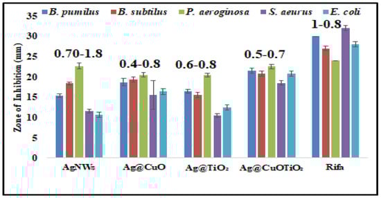 The antibacterial activity of the prepared samples including Ag NWs, Ag@CuO, Ag@TiO2, and Ag@CuO/TiO2 nanohybrids was tested toward Gram-positive bacteria (Staphylococcus aureus, Bacillus subtilis, and Bacillus pumilus) and Gram-negative bacteria (Pseudomonas aeruginosa and Escherichia coli), as shown in Figure 9. “Rifaximin” was used as a standard antibiotic in this evaluation. The zone of inhibition surrounding the well in the Petri dish was utilized to analyze the inhibitory power of the sample in millimeters. Figure 9 provides a detailed representation of the zone of inhibition using a bar graph. The bar graph indicates a general trend where each binary nanodesign of the Ag NWs exhibited higher inhibition zones than the pristine Ag NWs against all of the selected bacteria strains. Moreover, the ternary hybridized design Ag@CuO/TiO2 displayed the highest zones of inhibition: 24.8 ± 1.0, 23 ± 0.6, 24.4 ± 0.7, 19.4 ± 0.4, and 22.6 ± 0.6 for B. subtilis, B. pumilus, S. aureus, P. aeruginosa, and E. coli, respectively. The hybridized sample seemed to be closer to the antimicrobial activities of the standard used, where the values were mostly above 80%. The antimicrobial mechanism involves the interaction of Ag ions with bacteria and leads to the inhibition of cell growth and division. Therefore, the Ag NWs release silver ions, which adhere to the cell wall and cytoplasmic membrane, increasing their permeability [51]. Thus, cell rupture resulted, which led to cell death. When the Ag NWs were coated with CuO, TiO2, and their mixed form, they greatly increased the production of reactive oxygen species (ROS), which mainly react with proteins and DNA and also affect the ribosome [52]. Moreover, the presence of a higher number of surface defects in the binary and ternary Ag nanodesigns (Ag@CuO, Ag@TiO2, and Ag@CuO/TiO2) in comparison to that in the pristine Ag NWs was attributed to the high surface reactivity against bacterial cells, and hence responsible for better antibacterial activity against the tested pathogens. The metal oxide makes an ultra-thin amorphous sheath that can strongly interact with the pathogens. Moreover, these materials have also been reported as an antimicrobial; as Ag was the core material, their activity increased significantly.