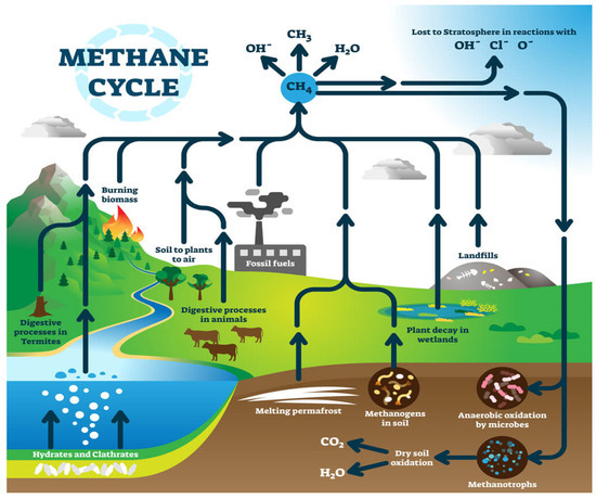 The methane cycle diagram illustrates the various sources and sinks of CH4 in the environment. It includes processes such as fossil fuel combustion, emissions from landfills, CH4 release from wetlands, plant decomposition, methane release due to permafrost melting, and digestion by termites and animals, among others. These processes contribute to the natural flux of CH4 in the atmosphere, impacting its concentration and ultimately influencing climate change and global warming, and are illustrated in Figure 1 [2].