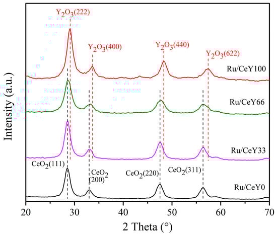 The results obtained from the N2 physisorption at −196 °C (Figure 4) revealed that all the powders exhibited type IV isotherms according to the IUPAC classification, which is characteristic of mesoporous materials. The isotherms displayed H3 hysteresis loops (Figure 4), which are typically associated with slit-like pores. The textural properties derived from these measurements are summarized in Table 1. Among the materials studied, the Ru/CeY0 sample exhibited the highest surface area (106.3 m2 g−1), while the Y2O3-supported Ru sample (Ru/CeY100) showed the lowest surface area (41.7 m2 g−1). In addition, it was observed that the incorporation of Y2O3 to the CeO2 generated a decrease in the specific surface area obtaining values of 65.9 and 51.8 m2 g−1 for the Ru/CeY33 and Ru/CeY66 catalyst, respectively. Regarding the average pore diameter, no clear trend was observed with varying Y2O3 content, with values ranging between 7.4 and 9.4 nm.