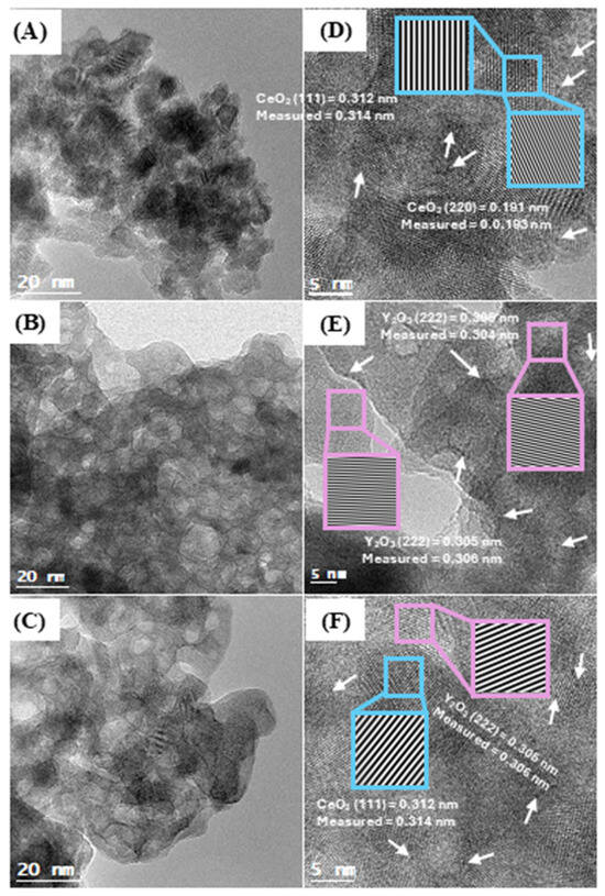 Figure 2 shows TEM and HR-TEM images obtained from Ru/CeY0, Ru/CeY100 and Ru/CeY33 catalysts. In the case of TEM images (Figure 2A–C), it is observed that all samples display a similar nanoplate morphology. On the other hand, in the image obtained by HR-TEM of the Ru/100Ce sample (Figure 2D–F), it was possible to determine different interplanar distances associated with (111) and (220) planes of the fluorite phase of CeO2, while the measurement of the crystallographic planes of the Ru/CeY100 catalyst corresponds to (222) plane characteristic of α-Y2O3. In addition, in the HR-TEM image corresponding to the Ru/CeY33 catalyst (Figure 2F), it was possible to estimate two interlayers spacing neighboring (0.314 and 0.306 nm) which correspond to (111) and (220) planes, the most representative, of the cerium oxide and yttrium oxide. This confirms the presence of both metal oxides in inner contact in the supporting composite. Furthermore, in all images obtained by HR-TEM, there are darker entities below 1 nm (marked with arrows) dispersed homogeneously over the surface of support materials, which could be associated with ruthenium species.