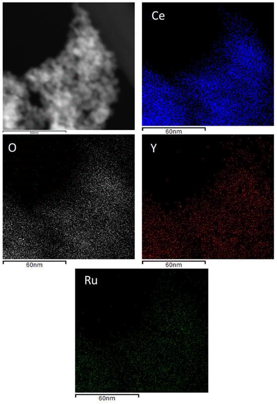 EDS elemental mapping images of the Ru/CeY0, Ru/CeY100, and Ru/CeY33 catalysts are displayed in Figures S1 and S2 and Figure 3. The presence of ruthenium, oxygen, and cerium homogeneously distributed was observed (Figure S1). As expected, only ruthenium, oxygen, and yttrium elements, also homogeneously dispersed, were detected in the Ru/CeY100 material (Figure S2). In the case of Figure 3, the presence of ruthenium, oxygen, cerium, and yttrium elements was observed in the Ru/CeY33 material. EDS mapping, XRD, and HR-TEM results confirms the obtention of the Ru/metal oxide and Ru/metal oxide—metal oxide formation (metal = cerium or yttrium).
