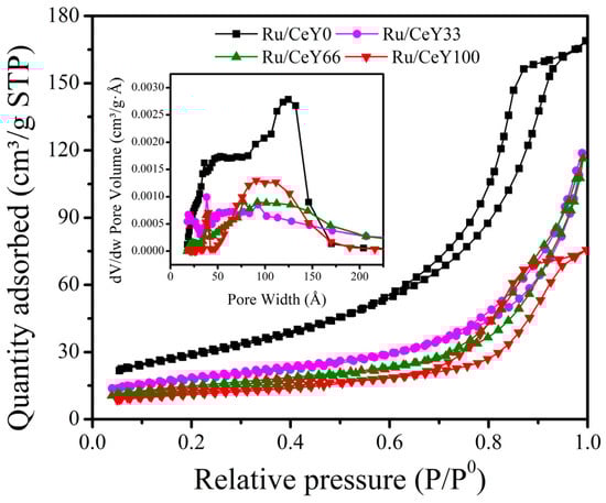N2 physisorption isotherms (−196 °C) of the samples of Ru supported on CeO2, Y2O3, and CeO2-Y2O3 materials, with inset of BJH pore size distribution.