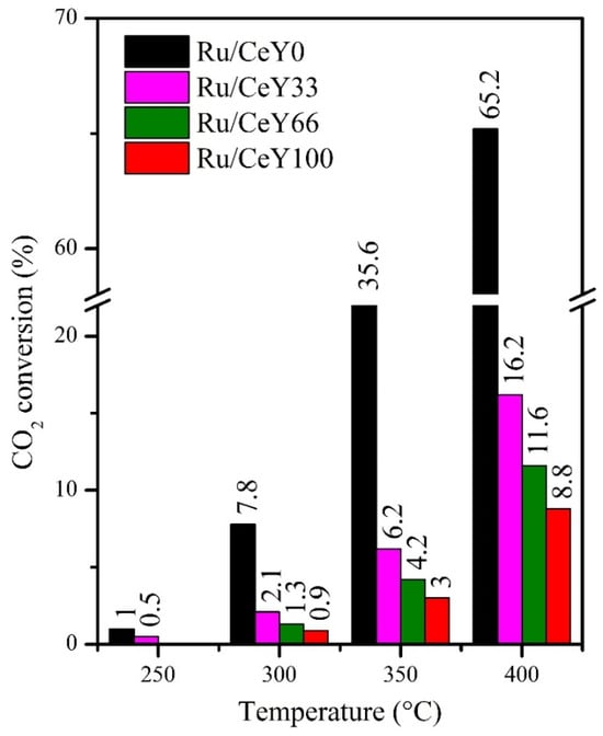 The CeO2-supported Ru catalyst (Ru/CeY0) achieved the highest CO2 conversion values across the temperature range from 250 °C to 400 °C. In contrast, the Ru catalyst supported on Y2O3 (Ru/CeY100) showed the lowest CO2 conversion, despite the ignition temperature shifting to 300 °C, which is 50 °C higher than that of Ru/CeY0. For the Ru catalysts on CeO2-Y2O3 mixed supports, it was observed that increasing the proportion of yttrium oxide resulted in a decrease in CO2 conversion during the catalytic tests. Overall, the CO2 conversion for all catalysts decreased in the following order: Ru/CeY0 > Ru/CeY33 > Ru/CeY66 > Ru/CeY100 (Figure 6). A similar trend was observed in the surface area data (Table 1), suggesting that the reduction in CO2 conversion may be linked to a decrease in the number of active sites available for the reaction.