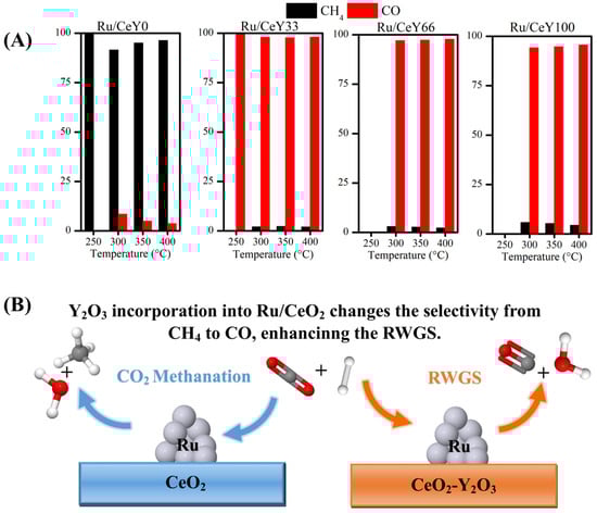The selectivity towards CO and CH4 for the catalysts is shown in Figure 7A. As observed, for the Ru/CeY0 catalyst, methane was the primary product, with carbon monoxide also being formed at higher temperatures (above 300 °C) in smaller amounts. This suggests that CO2 is predominantly converted to CH4 via CO2 methanation, as reported by other authors [53,54]. In contrast, for the Ru/Y2O3 sample (Ru/CeY100), carbon monoxide was the main product, with methane being produced in much lower quantities. This indicates that the reverse water–gas shift reaction is favored over the Sabatier reaction in this sample. These findings demonstrate that support can significantly influence the catalytic performance of supported metal catalysts, even when the same metal is used. For the catalysts of Ru supported on CeO2-Y2O3, the selectivity was predominantly towards carbon monoxide (Figure 7A), with the selectivity for methane being lower than that of the Ru/CeY100 sample. Figure 7B shows in a representative way the influence of Y2O3 in the selectivity of the CO2 hydrogenation reaction. This suggests that the combination of cerium and yttrium in the support partially inhibits CO2 methanation. This contrasts with the results reported by Sun et al. [55], since they observed an enhancement of CO2 methanation after the incorporation of Y2O3 into Ru/CeO2, which may be due to the lower yttrium oxide loading than our study.