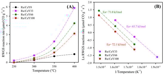 RWGS reaction rates for the catalysts are shown in Figure 8A. As estimated, the Ru/CeY0 catalyst exhibited the lowest CO generation rate among all the catalysts tested. The Ru/CeY100 sample demonstrated similar RWGS rates to Ru/CeY0 up to 300 °C. However, above this temperature, the difference in the RWGS rates between the two samples increased, with the Ru/CeY100 showing higher CO production. The Ru catalysts supported on CeO2-Y2O3 displayed higher CO production rates compared to Ru/CeY100. Notably, the sample with 33% w/w of Y2O3 in the support exhibited the highest CO generation, with the CO production rate at 400 °C nearly double that of the Ru/CeY100 sample (Ru/CeY33 = 5.9 µmol CO gcat−1 s−1 and Ru/CeY100 = 3.1 µmol CO gcat−1 s−1). These results suggest that an optimal combination of cerium oxide and yttrium oxide can enhance the conversion of CO2 to CO through the reverse water–gas shift reaction.