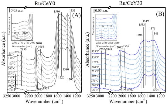 FTIR characterization of the (A) Ru/CeY0 and (B) Ru/CeY33 sample under the flow of the reactive mixture (12% CO2/48% H2/40% N2, v/v) at increasing temperatures at a heating rate of 5 °C/min.