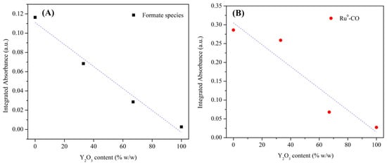 Correlation between (A) yttrium oxide content (% w/w) and the area of the ν(CH) band associated with formate species, and (B) yttrium oxide content (% w/w) and area of the ν(CO) band associated with Ru0-CO species.