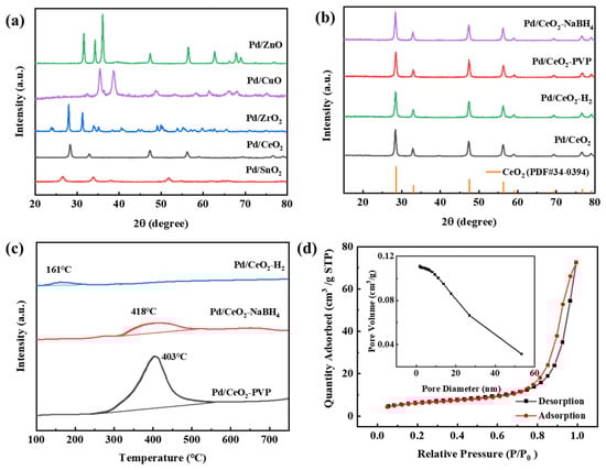 (a) XRD patterns of Pd/CuO, Pd/ZnO, Pd/CeO2, Pd/ZrO2, and Pd/SnO2 catalysts; (b) XRD patterns and (c) CO2-TPD of Pd/CeO2-NaBH4, Pd/CeO2-H2, and Pd/CeO2-PVP catalysts; (d) BET adsorption–desorption isotherms of Pd/CeO2-PVP catalyst.