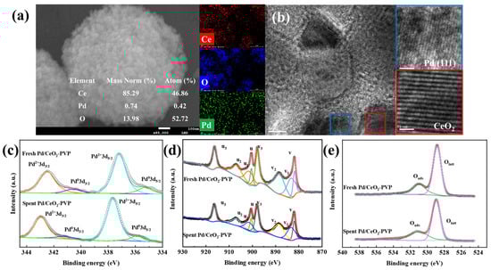 (a) SEM images and EDS analysis and (b) HRTEM image of fresh Pd/CeO2-PVP, (c) Pd 3d spectrum, (d) Ce 3d spectrum, and (e) O 1s spectrum of fresh and spent Pd/CeO2-PVP.