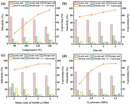 Catalytic performance of Pd/CeO2-NaBH4 catalyst in the 1,2-PDO catalytic oxidation under different reaction conditions. Reaction conditions: 1,2-PDO/total metal molar ratio = 500, stirring rate = 500 rpm, 1,2-PDO solution (50 mL, 0.05 M); (a) NaOH/1,2-PDO = 2, O2 pressure = 1.0 MPa, temperature = 80, 100, 120, and 140 °C, and reaction time = 2 h; (b) NaOH/1,2-PDO = 2, O2 pressure = 1.0 MPa, temperature = 120 °C, and reaction time = 1, 2, 3, and 4 h; (c) O2 pressure = 1.0 MPa, temperature = 120 °C, and reaction time = 2 h, NaOH/1,2-PDO = 1, 2, 3, and 4; (d) O2 pressure = 0, 0.5, 1, and 1.5 MPa, NaOH/1,2-PDO = 3, temperature = 120 °C, and reaction time = 2 h.