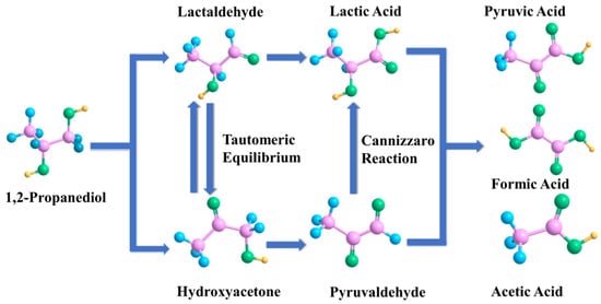 As the demand for fossil fuels continues to increase, the global energy crisis has intensified. Biomass energy, as a renewable resource, has garnered significant attention due to its environmental friendliness and sustainability [,,]. 1,2-Propanediol (1,2-PDO), an important downstream product of biomass conversion, holds potential as a platform molecule []. Through appropriate catalytic processes and reaction conditions, 1,2-PDO can be efficiently converted into valuable C1–C3 carboxylic acids such as lactic acid (LA), formic acid (FA), acetic acid (AA), and pyruvic acid (PA). These carboxylic acids not only have significant industrial applications but also offer new possibilities for sustainable chemistry and green chemical processes [,]. Additionally, biomass-derived 1,2-PDO presents great potential as an alternative to traditional petrochemical feedstocks, contributing to the reduction in fossil fuel dependence and promoting the low-carbon transformation of the chemical industry [].