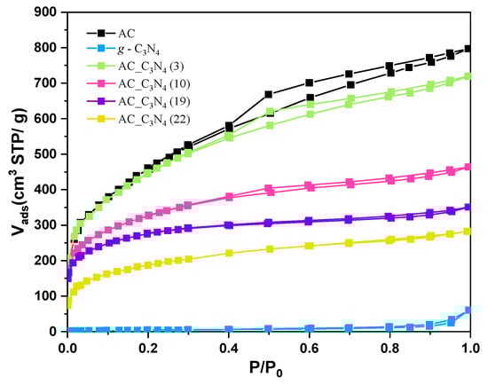 Figure 1 presents the N2 adsorption–desorption isotherms of AC, g-C3N4, and AC_C3N4 supports. As can be extracted from the shape of the isotherm of the AC sample, which is a combination of Type I and IV isotherms, the material has micropores and mesopores, as indicated by the sharp N2 uptake at low relative pressures and the slope and the hysteresis loop at higher relative pressures, respectively. C3N4 is a non-porous solid. As for the AC_C3N4 supports, adsorption capacity decreases with increasing C3N4 content and the shape of the isotherm confirms the presence of micropores, while the contribution of mesopores is less pronounced with increasing C3N4 content in the samples.