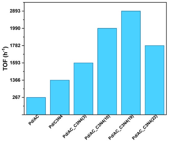 The initial TOF attained by all the studied catalysts in the second cycle is shown in Figure 3. As can be seen in that figure, the initial TOF values of Pd/AC_C3N4 catalysts increased with the C3N4 present in the samples, until reaching the best results with the Pd/AC_C3N4(19) sample, which showed an initial TOF value of 2893 h−1, which is higher than those values found in the literature for some other metal-based catalysts (for instance, Au2Pd8/SBA-15-Amine has an initial TOF of 1786 h−1 at 50 °C [], Pt0.5Pd0.5/NH2-N-rGO yields a TOF value of 511 h−1 at 25 °C [], Pd@CNFs has a TOF of 75 h−1 at 50 °C []). The further addition of C3N4 (sample Pd/AC_C3N4(22)) resulted in a decay in the catalytic activity, probably due to the significant blockage of the porosity of the AC_C3N4(22) support and the C3N4 stacking.