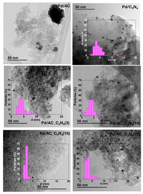 The formation of Pd nanoparticles under reaction conditions was corroborated by recording TEM micrographs of the spent catalysts (used in six consecutive cycles). Representative micrographs of Pd/AC, Pd/C3N4, and Pd/AC_C3N4 catalysts are depicted in Figure 4. All the C3N4-containing samples showed small and well-dispersed nanoparticles, and the average particle size was determined to be 4.2 ± 2.0, 4.8 ± 2.0, 3.8 ± 1.4, 2.3 ± 0.6, and 3.5 ± 1.2 nm for Pd/C3N4, Pd/AC_C3N4(3), Pd/AC_C3N4(10), Pd/AC_C3N4(19), and Pd/AC_C3N4(22), respectively. In contrast, very large aggregates were found in the Pd/AC sample. As for the histograms, the particle size distribution was relatively wide for all the samples except for Pd/AC_C3N4(19), which, aside from the smallest average size of the nanoparticles, also displayed the narrowest size distribution.