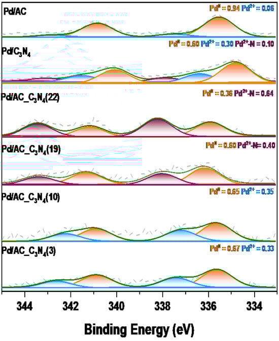 As for the electronic properties of Pd species, they were checked by XPS analysis. Pd spectra are plotted in Figure 5. The relative content of Pd0 and oxidized Pd species is also indicated in Figure 5. The presence of Pd0 is due to the in situ reduction that takes place during the reduction with the H2 that evolved from the decomposition of formic acid. As can be seen, the most significant contribution in Pd/AC is that of Pd0, which indicates that, in the N-free sample, Pd species are very efficiently reduced under reaction conditions. However, different behaviours are observed in the C3N4-containing samples. Pd/C3N4 presents an XPS spectrum in which three different contributions can be distinguished, which are centred at 334.8, 336.5, and 337.9 eV. The first signal (334.8 eV) is related to the presence of reduced Pd species, while the other two are due to electron-deficient species probably in the form of Pd2+ and Pd2+-N, as observed in other studies []. As for the Pd/AC_C3N4 catalysts, the signals are shifted towards higher binding energies in Pd/AC_C3N4(19) and Pd/AC_C3N4(22), compared to Pd/AC_C3N4(3) and Pd/AC_C3N4(10), suggesting that the electronic properties of Pd species are dependent on the composition of the support, and that higher N contents may favour the presence of more electron-deficient Pd species, which agrees with the role of nitrogen functional groups in stabilizing Pd2+ species [,]. It is important to mention that the presence of such electron-deficient Pd species is important to attain good catalytic performance in the studied application. The role of Pd2+ in catalyzing the decomposition of formic acid has already been claimed in several studies, and it is frequently related to the favoured adsorption of formate ions on the surface of Pd nanoparticles, which is usually described as the first reaction step in the generally accepted mechanism for the decomposition of formic acid [,,].
