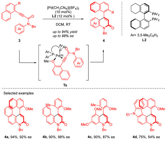 In 2011, Tanaka and his team proposed a palladium-catalyzed axially selective intramolecular hydroxylative aromatization strategy [55]. This method successfully synthesized the corresponding axially chiral 4-aryl-2-quinolone 4 from 3-aryl propargyl amide 3 using an optimized chiral ligand L2 with a palladium catalyst, as shown in Scheme 2. The researchers proposed a reasonable mechanism to explain how the synthesis of product 4 is achieved through asymmetric hydroxylative aromatization. The formation of the key intermediate Ts occurs through the chelation of the alkyne and ether groups with the palladium cation, significantly enhancing the reactivity of the alkyne. Moreover, the avoidance of steric interactions between the benzyl group of 3 and the aryl group of the chiral ligand allows for good control over the axial chirality of product 4.