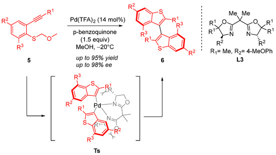 In 2019, Kato and his team reported the first asymmetric cyclization–dimerization reaction of (ortho-alkynylphenyl) (methoxymethyl) sulfide 5, successfully synthesizing enantiomerically enriched axially chiral dibenzothiophenes 6 (Scheme 3) [56]. The reaction mechanism involves the formation of a key intermediate—bisoxazoline. The reaction starts with the sulfur atom attacking the alkyne from below the palladium complex, followed by coordination with a second alkyne substrate, triggering a secondary cyclization and generating the target product through reductive elimination. Density functional theory (DFT) calculations suggest that the box ligand enhances the affinity of the palladium (II) intermediate for the alkyne, promoting the coordination of the benzothiophene–palladium (II) intermediate with the second alkyne, thereby facilitating the dimerization reaction. This method utilizes a palladium (II) bisoxazoline (box) catalyst to construct dibenzothiophenes in a one-step process, achieving efficient control of axial chirality. The final products exhibit good yields and optical purity.