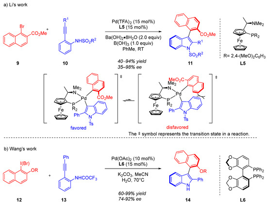 Meanwhile, Li and Qi focused their research on the asymmetric Cacchi reaction between aryl bromides and ortho-alkynyl anilines, utilizing an N,P-ligand based on ferrocene to provide a straightforward synthetic route for producing C(3)–C(aryl) axially chiral indole 11 (Scheme 5a) [58]. In this transformation, B(OH)2 as an additive significantly suppressed the formation of 3-unfunctionalized indoles. When phenol was used instead of aniline as the nucleophile, the yield and enantioselectivity of the resulting axially chiral naphthyl-fused furan were lower. Additionally, the experimental results indicated that the active organic palladium species in the catalytic cycle was derived from the Pd-C bond formed during cyclization. The Wang team developed a new method using Pd(0)/(S)-Segphos L6 to catalyze the asymmetric Cacchi reaction of 2-alkynyl anilines with sterically hindered naphthyl halides 12, successfully obtaining multiple axially chiral naphthyl-C3 indoles 14 containing free NH groups (Scheme 5b) [59]. Notably, the addition of water played a crucial role in this reaction, and the pre-mixing of the palladium complex with naphthyl halides was also necessary for the success of the reaction.