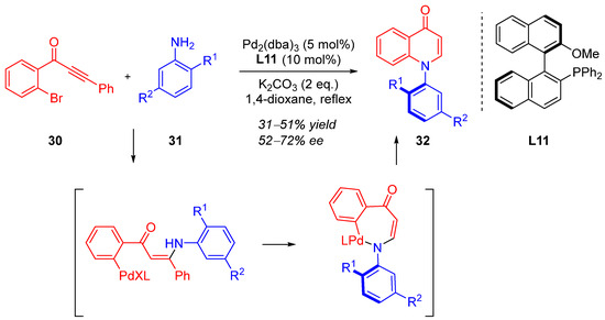 Asymmetric cyclization C–N coupling reactions are a crucial tool in organic synthesis, widely used in drug development and natural product synthesis [65,66,67]. With the continuous advancement of catalysts, the efficiency and selectivity of asymmetric C–N coupling reactions have significantly improved, evolving from early copper and nickel catalysts to palladium, rhodium, iridium, and even organocatalysts. The introduction of chiral ligands has further enhanced the stereoselectivity of these reactions, allowing for the synthesis of specific isomers. In-depth studies of the reaction mechanisms, which often involve steps like oxidative addition, insertion, and reductive elimination, have also driven the development of new catalytic systems. In recent years, the principles of green chemistry have increasingly been incorporated into this field, with more sustainable reaction conditions and eco-friendly catalysts being employed to lower costs and make the processes more economically viable. Asymmetric C–N coupling reactions are expanding their applications in fields such as pharmaceuticals, agrochemicals, and material science. They show great potential, particularly in synthesizing biologically active nitrogen-containing heterocyclic structures. In 2012, Kitagawa reported a method for constructing asymmetric products through a Buchwald–Hartwig amination–cyclization reaction. Using a palladium catalyst and the chiral ligand MOP L11, the reaction employed aniline 31 and ynone 30 as substrates (Scheme 10) [68]. The process begins with the 1,4-addition of 31 to 30, followed by an asymmetric C–N coupling reaction, ultimately yielding an axially chiral product 32. The method demonstrated good enantioselectivity, achieving an enantiomeric excess (ee) of up to 72%, showcasing its potential for asymmetric synthesis applications. This approach highlights a practical strategy for constructing axial chirality in organic molecules, particularly relevant for the synthesis of complex compounds with potential applications in pharmaceuticals and material sciences.