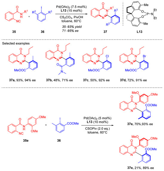 In 2021, Zhu’s group successfully synthesized 2-aryl quinazolinones 37 using a method that involved palladium-catalyzed imination–cyclization reactions (Scheme 12) [70]. This process entailed the reaction of N-substituted 2-isocyanobenzamide 35 with 2,6-disubstituted aryl iodides 36. The approach involved a sequence of biaryl coupling and heterocycle formation, offering an efficient and novel coupling–cyclization strategy for synthesizing axially chiral aryl-heteroaryl compounds. Notably, when the functionalized isocyanide coupling partner contained ortho-substituted aryl groups, the method enabled the construction of 4,2,3-diaryl quinazolinones with both diastereoselectivity and enantioselectivity, incorporating two stereocenters. This methodology provides the first general synthetic route for axially chiral 2-aryl quinazolinones, holding significant implications for biological applications and asymmetric synthesis.