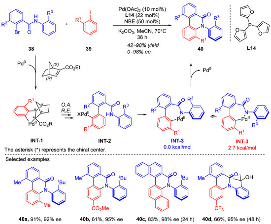 In 2021, the Zhou group proposed a modular and convergent approach to the synthesis of C–N axially chiral benzo [4]quinolizin-8-ones 40 via a palladium/chiral norbornene (NBE) synergistic catalysis strategy (Scheme 13) [71]. This method successfully achieved axial-to-axial chirality transfer, demonstrating high efficiency both in constructing adjacent axes through bisaxial-selective C–H arylation and in the diastereoselective synthesis of remote stereogenic axes via axial-to-axial induction. Mechanistic experiments and DFT calculations revealed that the bulky substituents at the ortho position of the aniline group played a critical role in stabilizing the C–N axial configuration. The reaction mechanism begins with the oxidative addition of the aryl iodide, followed by the insertion of chiral norbornene (NBE). Under the influence of a base, the aryl C–H bond is activated, forming intermediate INT-1. This is followed by a second oxidative addition, reductive elimination, and β-carbon elimination to generate the C–C axially chiral intermediate INT-2. Subsequently, an intramolecular amidation occurs, forming an aminopalladium(II) intermediate INT-3, which undergoes C–N reductive elimination to yield the target product.