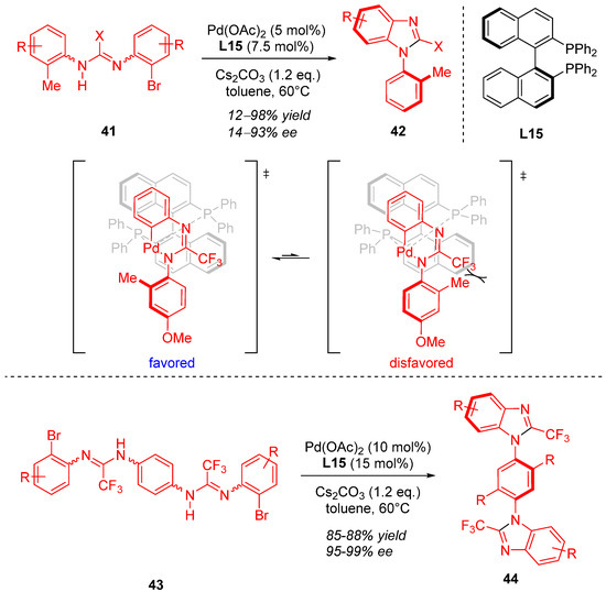 In 2021, Liu’s group developed a palladium-catalyzed selective amination method for benzamide 41, aimed at synthesizing N-C dual aryl twisted isomers (Scheme 14) [72]. This method enabled the convenient construction of various benzimidazole compounds 42 with excellent enantioselectivity, demonstrating N-C axial chirality. Their research also indicated that this method can be utilized to synthesize highly enantiomerically enriched 1,4- and 1,5-dibenzimidazole compounds 44, which contain two chiral N-C axes. Given that this method supports gram-scale synthesis and the diversified transformation of products, it shows great promise for application in the valuable synthesis of drugs featuring the N-C dual-aryl twisted isomer framework.
