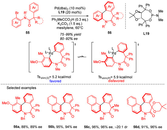 Subsequently, the Cramer group employed a similar TADDOL-derived phosphoramidite ligand L19. They proposed a straightforward method for synthesizing axially chiral dibenzazepinone 56 through palladium-catalyzed atroposelective C–H arylation (Scheme 18) [81]. Their study found that the steric bulk near the biaryl linker was crucial for the enantioselectivity of the reaction. Additionally, DFT calculations indicated that C–H functionalization was achieved through a chirality-determining CMD mechanism, forming a configurationally stable eight-membered palladacycle.