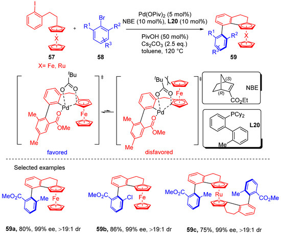 The synthesis of ferrocene compounds with both axial and planar chiralities poses a significant challenge. Zhou and his team proposed a novel strategy for constructing both types of chirality in ferrocene systems through palladium/chiral norbornene (Pd/NBE*) cooperative catalysis (Scheme 19) [82]. In this unique multi-step reaction, the initially established axial chirality is determined by the Pd/NBE* cooperative catalysis, while the subsequent planar chirality is controlled by a distinct axial-to-planar diastereoinduction process, influenced by the pre-existing axial chirality. This method utilizes readily available ortho-ferrocene-tethered aryl iodides 57 and 2,6-disubstituted aryl bromides 58 as starting materials. Ultimately, the research team successfully obtained a variety of benzo-fused ferrocenes 59 with five- to seven-membered rings in a single reaction, achieving consistently high levels of enantioselectivity (>99% e.e.) and diastereoselectivity (>19:1 d.r.). This study provided new insights and methods for the preparation of ferrocene compounds exhibiting both axial and planar chiralities.