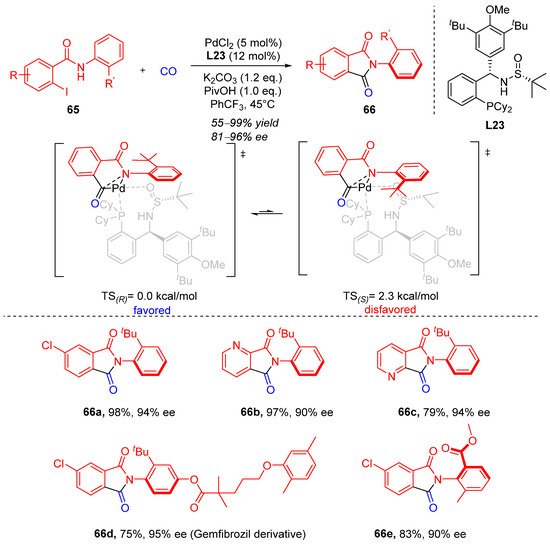 In 2021, Li’s group reported, for the first time, a palladium-catalyzed asymmetric carbonylation reaction of aryl iodides 60 with carbon monoxide (CO), achieving enantioselective synthesis of 2-arylisoindoline-1,3-diones and N-acetyl-N-phenylbenzamides (Scheme 21) [84]. The reaction demonstrated excellent yields (up to 99%) and high enantioselectivity (up to 96% ee), marking the first example of embedding a carbonyl group into axially chiral amides via a carbonylative reaction. By controlling the position of substituents on the substrates, the group elegantly constructed a pair of enantiomeric 2-arylisoindoline-1,3-diones. Additionally, this method shows potential for application in the synthesis of lead compounds that inhibit NF-κB activation in HeLa cells, as well as for late-stage modifications of known bioactive molecules.