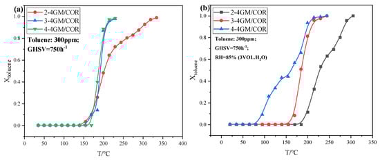 Lifetime test of 4-4GM/COR monolithic catalyst on toluene conversion: (a) dry atmosphere; (b) humid atmosphere (toluene: 300 ppm; WHSV: 750 h−1).