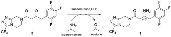 - Zhang, X.; Fan, H.; Liu, N.; Wang, X.; Cheng, F.; Liu, Z.; Zheng, Y. A novel self-sufficient biocatalyst based on transaminase and pyridoxal 5′-T phosphate covalent co-immobilization and its application in continuous biosynthesis of sitagliptin. Enz. Microb. Technol. 2019, 130, 109362. [Google Scholar] [CrossRef] [PubMed]