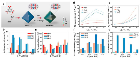 (a) Synthesis scheme of the Pd/HKUST-1. CO2RR activities of samples: (b) FE for CO, (c) FE for H2, (d) partial current density for CO production, (e) partial current density for H2 production, and (f) Pd mass activity for CO for the prepared catalysts as a function of applied electrochemical potential. (g) FE for CO of HP-2 and its derivatives, obtained by pyrolysis in the air (HP-2-Air) and Ar (HP-2-Ar) atmospheres, as a function of applied electrochemical potential. Reproduced with permission from ref. [38]. Copyright Wiley-VCH GmbH, 2024.