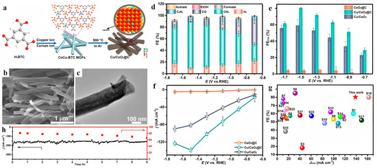 In addition, encapsulating active sites within carbon layers has proven effective in preventing aggregation and enhancing charge transfer. In order to enhance the performance of catalysts, the in situ carbon-encapsulated Cu/CeO2@C catalyst, reported by Zhang et al. [47], introduced a carbon-encapsulated copper-doped cerium oxide composite (Cu/CeO2@C) derived from MOFs for boosting CO2-to-CH4 electro-conversion (Figure 2). This innovative catalyst achieved a remarkable methane FE of 80.3% and a high partial current density of 138.6 mA/cm2 at −1.5 V vs. RHE. The superior performance of Cu/CeO2@C was attributed to the synergistic effect between the Cu/CeO2 active component and the in situ-formed carbon layer, which not only prevented the agglomeration of metal NPs but also provided robust channels to facilitate charge transfer. Additionally, the carbon encapsulation strengthened the adsorption of CO2 and reaction intermediates on the active sites, ultimately accelerating the reaction kinetics and improving the selectivity towards methane production.