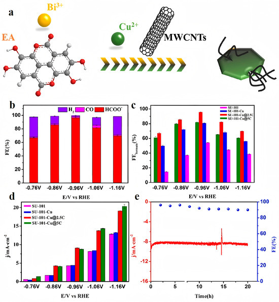 Zou et al. introduced a novel BiCu bimetallic organic framework composite catalyst, SU-101-Cu@2.5C, for efficient electrochemical CO2 reduction to formate [54]. The catalyst was synthesized via in situ modification with multi-walled carbon CNTs (MWCNTs) at room temperature, utilizing ellagic acid as the linker. SU-101-Cu@2.5C exhibited remarkable performance, with a small onset potential of −0.46 V vs. RHE, partial current densities exceeding 100 mA/cm2, and a significantly improved FE close to 100% for formate at −0.86 V vs. RHE, as the voltage increased from −0.76 to −0.96 V vs. RHE. Notably, the FE remained above 80% within a wide potential window of −0.86 to −1.06 V vs. RHE, indicating a robust selectivity for formate production over a range of voltages. Density functional theory calculations revealed that Bi served as the active center for CO2 reduction, while the introduction of Cu optimized the overall electronic structure, enhancing catalytic efficiency. The incorporation of MWCNTs significantly facilitated rapid electron transfer, contributing to the excellent electrocatalytic performance. After 30 h of continuous catalysis, SU-101-Cu@2.5C maintained good efficiency and stability, demonstrating its potential for large-scale applications (Figure 3).