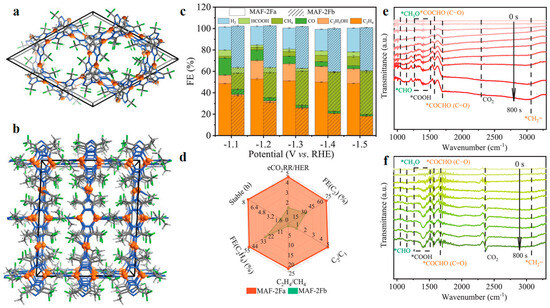 (a) Crystal structures of MAF-2Fa. (b) Crystal structures of MAF-2Fb. (c) FEs of MAF-2Fa and MAF-2Fb. (d) Comparison of typical performances at −1.2 V vs. RHE. (e) ATR-FTIR spectra of MAF-2Fa. (f) ATR-FTIR spectra of MAF-2Fb. Reproduced with permission from ref. [63]. Copyright Wiley-VCH GmbH, 2024.