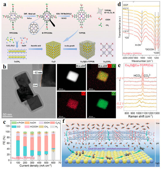 (a) Synthesis scheme for Cu2O@Cu-TCPP(M) (M = Fe, Co, and Ni). (b) HR-TEM images and TEM-EDX elemental mapping images of Cu2O@Cu-TCPP (Co). (c) FE of different reduction products under various current densities for Cu2O@Cu-TCPP(Co). (d) In situ ATR-SEIRAS spectra taken on Cu2O@Cu-TCPP(Co). (e) Operando Raman spectra recorded for measuring local pH on Cu2O@Cu-TCPP(Co). (f) Schematic illustration of the Cu-TCPP(M) (M = Co, Fe) overlayer on Cu2O to boost local CO and OH− concentrations at the interface. Reproduced with permission from ref. [64]. Copyright Wiley-VCH GmbH, 2024.
