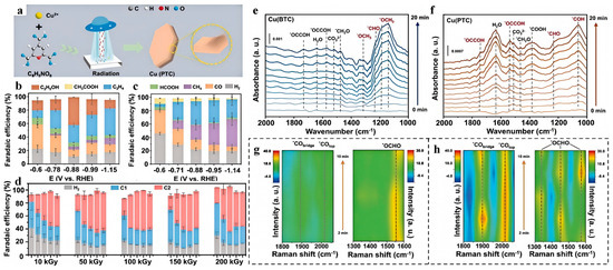 (a) A schematic illustration of the synthesis process of MOFs. (b) FE of Cu(PTC). (c) FE of Cu(BTC). (d) The FE of Cu(PTC) under different irradiation doses. (e) In situ ATR-FTIR spectra of Cu(BTC). (f) In situ ATR-FTIR spectra of Cu(PTC). (g) In situ Raman spectra of Cu(BTC). (h) In situ Raman spectra of Cu(PTC). Reproduced with permission from ref. [86]. Copyright Wiley-VCH GmbH, 2024.
