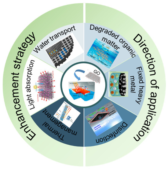 Graphene-based SDIE systems demonstrate significant advantages in water treatment. The core mechanism integrates the synergistic effects of photothermal–adsorption–catalysis and a multi-stage targeted removal mechanism for pollutants. The high specific surface area of graphene and its rich oxygen-containing functional groups endow it with excellent physical adsorption capabilities, enabling the efficient enrichment of heavy metal ions and organic pollutants. Simultaneously, its broad-spectrum absorption properties convert solar energy into heat, driving the generation of photogenerated carriers and activating the catalytic sites, which decompose pollutants via free radical oxidation or direct electron transfer pathways. Additionally, the vapor flow produced by evaporation can carry volatile pollutants to the condensation interface for selective separation. This adsorption–catalysis–evaporation synergy driven by solar energy provides a green solution for the efficient purification and resource recovery of complex wastewater.