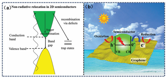 Meanwhile, the localized temperature rise induced by the photothermal effect exerts multidimensional synergistic enhancements on photocatalytic processes. First, the input of thermal energy reduces the recombination probability of photogenerated carriers by enhancing their kinetic energy to overcome the Schottky barrier at heterojunction interfaces, thereby accelerating the directional separation and migration of electron–hole pairs (Figure 2b). Second, elevated temperature significantly modulates the adsorption–desorption equilibrium of reactant molecules on the catalyst surface, lowering the reaction activation energy and promoting the diffusion mass transfer of intermediate products, which optimizes the kinetic pathways of redox reactions. More importantly, the interfacial coupling effects between graphene and photocatalytic components enable cooperative regulation of energy band structures. Photothermally induced lattice vibrations (alterations in phonon modes) may facilitate the formation of dynamic charge transport channels at heterojunction interfaces, while thermal perturbations partially compensate for the bandgap limitations of semiconductor materials, allowing carrier transitions under lower-energy photon excitation. This photothermal synergy mechanism not only enhances the comprehensive utilization efficiency of solar energy but also provides theoretical foundations for designing high-efficiency photocatalytic systems capable of adapting to ambient temperature variations. Through precise regulation of the microstructure, interfacial properties, and photothermal response behavior of graphene composites, cross-scale optimization of energy transfer and material conversion in photocatalytic reactions can be achieved, paving new pathways for clean energy conversion and environmental remediation technologies.