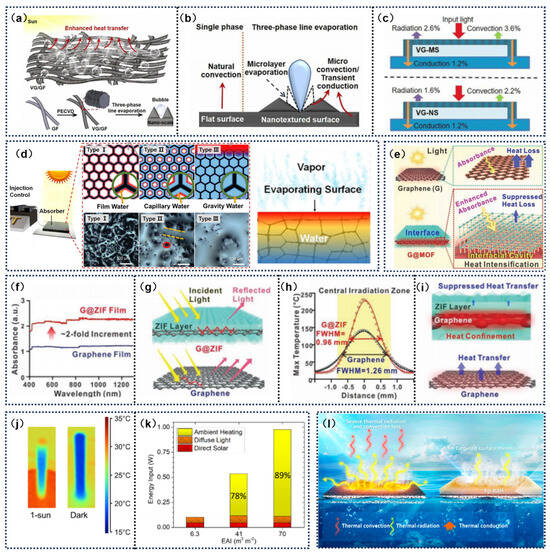 (a) Schematic illustration of bubble formation on a nanotextured surface during SDIE. (b) Mechanism of enhanced heat transfer through nanostructuring. (c) Heat transfer diagram of microstructured and nanostructured absorbers during evaporation. Reprinted with permission from ref. [98]. Copyright 2022 Elsevie; (d) Schematic of the formation process of a composite material made from hollow melamine foam and rGO. Reprinted with permission from ref. [99]. Copyright 2019 John Wiley and Sons. (e) Diagram of G@MOF, which enhances light absorption and suppresses heat loss, thereby concentrating thermal energy at the confined interface. (f) UV-Vis-NIR absorption of graphene and g@ZIF membranes. (g) Enhanced light absorption of g@ZIF. (h) Spatial temperature distribution in the central irradiated area under laser illumination at maximum equilibrium surface temperature. (i) Thermal localization and suppression of heat transfer in G@ZIF. Reprinted with permission from ref. [100]. Copyright 2021 John Wiley and Sons. (j) 3D thermal images of stems under light and dark conditions. (k) Contributions of direct solar energy, diffuse light, and ambient heating to energy input. Reprinted with permission from ref. [101]. Copyright 2021 American Chemical Society. (l) Schematic of hp RAH photothermal films. Reprinted with permission from ref. [102]. Copyright 2021 American Chemical Society.