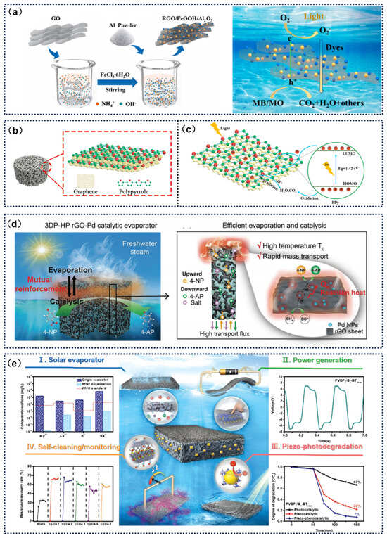 Ma et al. [41] designed a novel reduced graphene oxide/FeOOH (RGO/FeOOH) asymmetric evaporator and demonstrated its excellent photocatalytic degradation ability for organic pollutants in water (Figure 10a). Yan et al. [70] developed a graphene oxide-polypyrrole (GR/PPY) composite aerogel that innovatively realized the dual functions of wastewater purification and freshwater regeneration. The nanocomposite material, prepared by a stepwise hydrothermal-reduction–freeze-drying method, effectively suppressed the stacking of graphene sheets through π–π conjugation between components, constructing a cross-scale network structure with micron-scale fluid channels and nano active sites. This unique configuration significantly enhanced the adsorption–catalysis synergistic effect for organic pollutants by increasing the surface π–electron cloud density. The experimental data showed that the aerogel achieved degradation rates of 96.4%, 92.5%, and 82.6% for typical organic pollutants like Rhodamine B (RHB), phenol, and ciprofloxacin (CIP), respectively, confirming its multifunctional potential in water treatment applications (Figure 10b,c). Li et al. [126] developed a reduced graphene oxide–palladium (rGO–Pd) composite evaporator, which innovatively realized a synergy between SDIE and catalytic reactions. The system exhibited an enhanced apparent utilization rate of solar thermal energy by coupling the evaporation and catalytic energy conversion pathways. The experimental results indicated that thanks to the self-supply of reaction heat, this evaporator achieved a record-breaking water production rate of 12.7 L·m−2·h−1 under saline conditions, far superior to that of existing integrated SDIE systems. Its multi-porous rGO–Pd composite structure created efficient mass transfer channels, combining photothermal effects and rapid material transport, which improved the catalytic activity of Pd to 125.07 min−1—an increase of 275% compared to dark-state conditions. This integrated SDIE system simultaneously enabled freshwater preparation, salt crystallization, and catalytic product recovery, achieving the full-resource utilization of aqueous media (Figure 10d). Huang et al. [127] successfully constructed a multifunctional nanocomposite system based on polyvinylidene fluoride (PVDF)/graphene–BaTiO3 through β-phase self-assembly technology. This material integrated solar evaporation, piezoelectric power generation, pollutant degradation, and self-cleaning functions. Experiments confirmed that, due to the piezoelectric–photonic synergistic coupling effect, the material system effectively suppressed the recombination of photogenerated carriers. Under dynamic conditions, it achieved a 93% degradation efficiency for dyes while also enhancing membrane anti-fouling by 200%. This piezoelectric-catalysis and photocatalysis cross-scale energy synergy mechanism provides a new technological paradigm for the development of smart water treatment systems (Figure 10e).