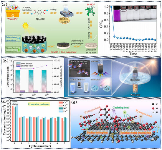 Fan et al. [43] innovatively converted waste polyethylene terephthalate (PET) into bismuth-based metal–organic framework (Bi-MOF) microcrystals and built a solar-driven system that simultaneously reduced hexavalent chromium and produced freshwater. The Bi-MOF/graphene composite evaporator demonstrated broad-spectrum light absorption (380–2500 nm), 92.3% photothermal conversion efficiency, and a 0.12° water contact angle. When coupled with a photo-Fenton catalytic system, the localized micro-effect generated during the interface evaporation process significantly enhanced hydrogen peroxide activation, achieving a hexavalent chromium reduction efficiency of 91.3%, with a reaction rate constant of 0.0548 min−1—178% higher than that of traditional non-evaporation systems. This solar-driven microenvironment regulation mechanism provides a new technological coupling path for heavy metal pollution control and water resource regeneration (Figure 11a). Tian et al. [130] innovatively combined Ag-MnO2 catalytic nanostructures with nitrogen-doped graphene aerogels, creating a three-dimensional cylindrical evaporator (SMNG) with both ultra-high evaporation performance and efficient water treatment capability. Under light irradiation, this device achieved an evaporation rate of 6.46 kg·m−2·h−1 with a 90.25% photothermal conversion efficiency. For seawater desalination applications, the SMNG exhibited an evaporation performance of 6.15 kg·m−2·h−1 and 99.9% ion removal efficiency. In outdoor tests, its evaporation performance was improved to 8.57 kg·m−2·h−1, confirming its practical feasibility. This design not only optimized evaporation efficiency and energy conversion performance but also significantly enhanced wastewater treatment ability through catalytic properties, achieving over 99.9% purification efficiency for organic dyes, heavy metal ions, formaldehyde, and E. coli (Figure 11b). Dong et al. [131] prepared a porous hydrophilic/hydrophobic cellulose graphene aerogel (CGA) for application in solar-driven water evaporation systems to achieve seawater desalination and heavy metal wastewater purification. By leveraging the synergistic effects of interfacial evaporation and adsorption, the CGA utilizes oxygen-containing functional groups to form hydrogen bonds and chelating bonds with heavy metal ions (e.g., Ni2+, Cu2+, Pb2+, Cd2+), effectively reducing the concentration of heavy metals in wastewater to trace levels and significantly decreasing the wastewater volume (Figure 11c,d).