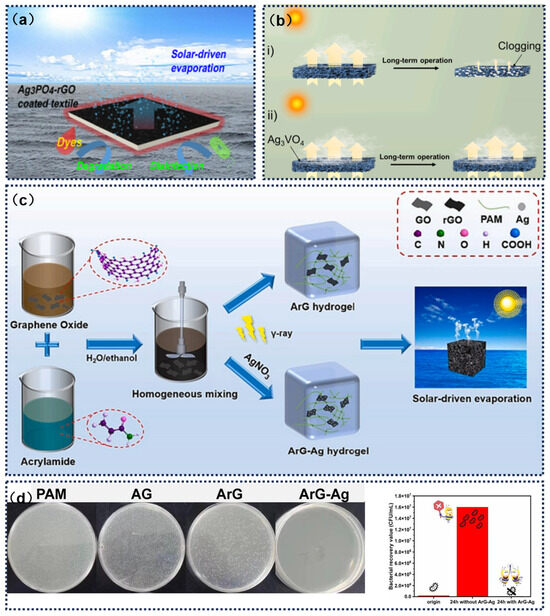 Lu et al. [134] developed a seawater desalination composite membrane material with enhanced antimicrobial properties. The study evenly dispersed GO nanosheets within a polymer matrix, utilizing magnetic field-controlled solvent evaporation dynamics to prepare vertically oriented GO nanocomposite films. This unique orientation significantly enhanced the interface effects at the edges of the nanosheets, fundamentally improving the material’s antibacterial properties. This nanocomposite membrane is not only suitable for seawater desalination but also exhibits multifunctional potential in environmental engineering, such as serving as high-performance sensors, catalytic electrode materials, and efficient adsorption media (Figure 12a). Noureen et al. [42] developed a functionalized coating fabric based on an Ag3PO4-reduced graphene oxide (Ag3PO4-rGO) nanocomposite system. The material was loaded onto a cotton substrate to form a solar-driven floating water purification device. This fabric achieved an evaporation rate of 1.31 kg·m−2·h−1 by converting solar heat to enhance interface temperature, while integrating the photocatalytic degradation of organic dyes and microbial inactivation. Moreover, they proposed an innovative photothermal aerogel design by constructing a three-dimensional porous system with an Ag3VO4-rGO composite structure, which incorporated solar steam generation, pollutant photocatalysis, and seawater desalination functions, forming a highly efficient water treatment system (Figure 12b) [135]. Lin et al. [136] constructed a polyacrylamide-reduced graphene oxide composite hydrogel system based on radiation reduction technology, which simultaneously loaded silver nanoparticles to form a porous ArG–Ag composite hydrogel. This material integrated rapid water transport channels, localized thermal effects, and low evaporation enthalpy properties, achieving an evaporation rate of 3.089 kg·m−2·h−1 under standard illumination, with energy conversion efficiency exceeding 122.7%. Its structural design provided both mechanical strength and salt tolerance, effectively regulating ion migration for water purification. The system demonstrated a 99% inhibition rate against E. coli after 24 h and exhibited long-term antifungal properties, significantly enhancing anti-biofouling performance. This research innovatively integrated high-efficiency evaporation, salt regulation, broad-spectrum antibacterial, fungal inhibition, and catalytic functions into a single system, offering a new multifunctional solution for marine environmental applications (Figure 12c,d).