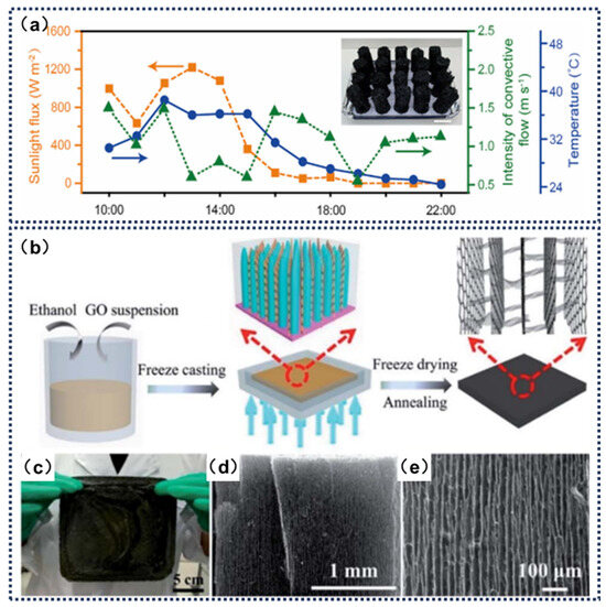 (a) Outdoor evaporation of large equipment settings. Outdoor conditions for evaporation: incident sunlight flux, intensity of natural convective flow, and ambient temperature over time. Reprinted with permission from ref. [137]. Copyright 2025 Elsevier. (b) Manufacturing process and characterization diagram of VA-GSM. (c) VA-GSM monocoque photo with a size of 16 cm × 16 cm. (d,e) SEM images of VA-GSM at different magnifications. Reprinted with permission from ref. [138] Copyright 2017 American Chemical Society.