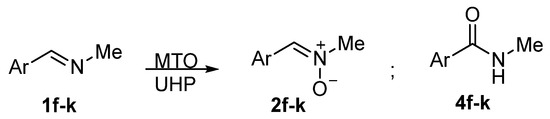 The standard procedure for the oxidation in MeOH (0.5 M concentration of imine, 3 equiv. UHP, 2 mol% MTO, 20 °C) proved to be satisfying for the selective conversion of imines 1f–k to the corresponding nitrones 2f–k as expected (Table 2, entries 1, 5, 7, 9, 11, and 13). The structural assignment was unequivocally based on the signals of N-H as a broad singlet and N-methyl as a doublet (δ = 2.8–3.1 ppm) in the 1H NMR spectrum, and by comparing with the literature data (see Supplementary Materials). Only in the case of p-nitrobenzaldimine 1j did the reaction not go to complete conversion (82% after 20 h, entry 11), showing that N-oxidation is slightly affected by electronic factors with electron-withdrawing groups slowing down the process. Moreover, in this case, and in the case of C-2-naphthyl substituted imine 1k, small amounts (ca. 6%) of amides 4j and 4k, respectively, were detected alongside the nitrones 2j and 2k (entries 11 and 13).