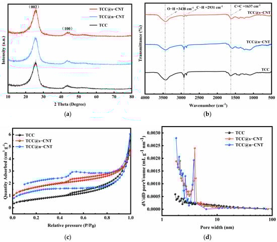 The structures of each obtained sample were further analyzed, as shown in Figure 2. In Figure 2a, the XRD results show that after CNTs grow on the TCC surface, the half-peak width corresponding to the (002) crystal plane increases, and the peak intensity decreases slightly. This indicates that the TCC@s-CNT and TCC@n-CNT reduce the degree of graphitization of the electrode material and increase the quantity of defects. This is consistent with the theory in the Scherrer equation that lattice distortion leads to the broadening of diffraction peaks []. This result is also in line with the introduction of structural defects in CNTs grown in the gas phase due to rapid growth kinetics, resulting in a decrease in the orderliness of graphite microcrystals []. Further comparison also revealed that the half-peak width of the (002) crystal plane of the TCC@s-CNT is larger than that of the TCC@n-CNT, confirming the higher defect density of the helical CNT. The high defect density formed during the growth process of helical CNTs is related to the additional defects caused by stress release or twisted structures []. Similar studies have demonstrated that sp3 hybridized carbon or edge defects are more pronounced in curled or helical CNTs [].