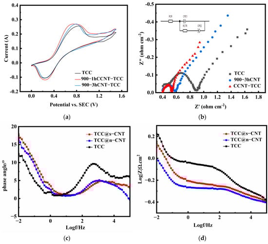 The Bode plots for each sample are presented in Figure 3c,d. Figure 3c illustrates the relationship between the phase angle and frequency. As depicted, the three samples exhibit pronounced peak phase angles within the medium-frequency range, which indicates the presence of a charge-transfer process. Figure 3d demonstrates the relationship between the modulus value and frequency. The results reveal that the impedance modulus of TCC is higher than that of the TCC@s-CNT and TCC@n-CNT in both low- and high-frequency regions, suggesting that the TCC has a larger charge-transfer resistance and electrolyte ohmic resistance on its surface. These characteristics align with the RCTR and Rs values obtained through EIS fitting. Due to the influence of double-layer capacitance, the RCTR value of the TCC@n-CNT in the Bode plot is lower than that of the TCC@s-CNT.